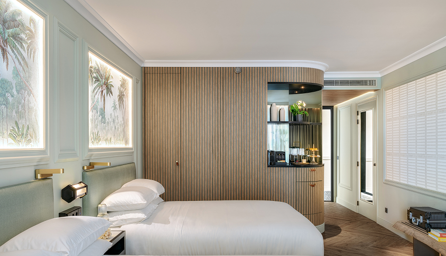 Suites para un descanso profundo. Luz suave, camas generosas y puertas de altura completa hacia terrazas o balcones privados. Texturas nobles y silencio a voluntad crean calma. Café al amanecer y la piscina o el mar a pocos pasos.